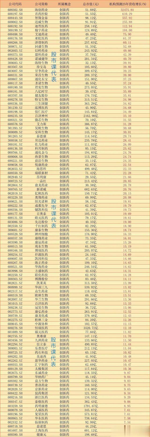 机构预测创新药企25年营收增长率