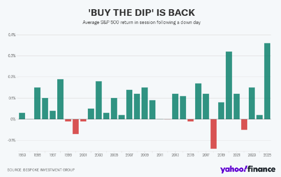 Bespoke投资集团的研究显示,今年以来,标普500指数(^GSPC)在下跌日后的下一个交易日平均上涨0.36%。根据Bespoke可追溯至1993年的数据,股市此前仅在2020年出现过接近这一强劲反弹的情况——下跌日后平均上涨0.32%。