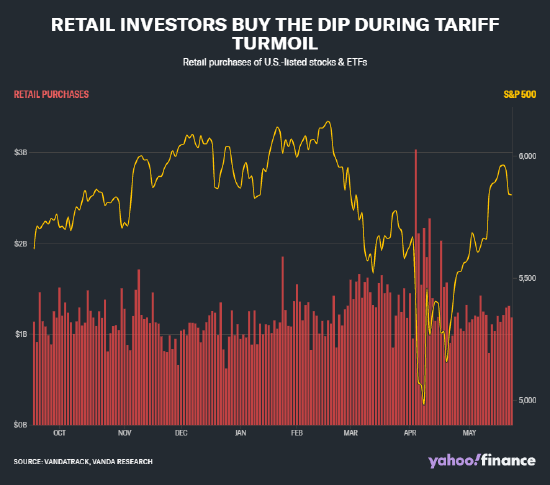 自市场最近一次在4月8日触底以来,标普500指数已上涨近19%。在很大程度上,散户投资者一直是这波涨势的引领者。摩根大通量化策略师艾玛・吴的数据显示,自4月8日低点以来,散户投资者已向美国股市注入超过500亿美元资金。这一数字超过了2020年3月至6月期间散户投资者投入市场的460亿美元。